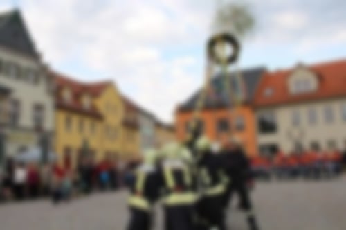 Am 30.April knüpfen die Kameradinnen der Frauenabteilung den Kranz und binden bunte Bänder um das frische Grün. Mitglieder der Jugendfeuerwehr und starke Männer der Einsatzabteilung tragen feierlich den Maibaum auf den Marktplatz. Viele Menschen begleiten diese Zeremonie, die durch wechselnde Musikanten aus der Region begleitet wird.